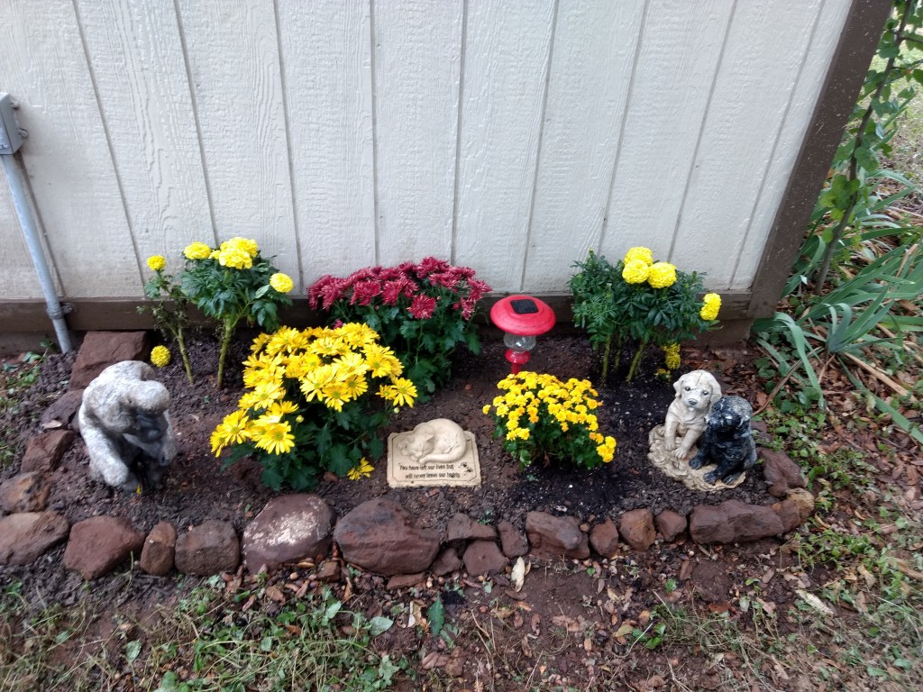 Heike and I, two women in our 70s, dug a hole in the rocky, Central Texas ground and laid him to rest by my shed in the shade of one of my oak trees. I’m still deciding what to plant on his grave. The rocks you see around it all came out of the hole itself. We got as deep as we could until the rocks were too big to remove. In the next few days I’ll make it prettier and a decent memorial to an awesome cat.